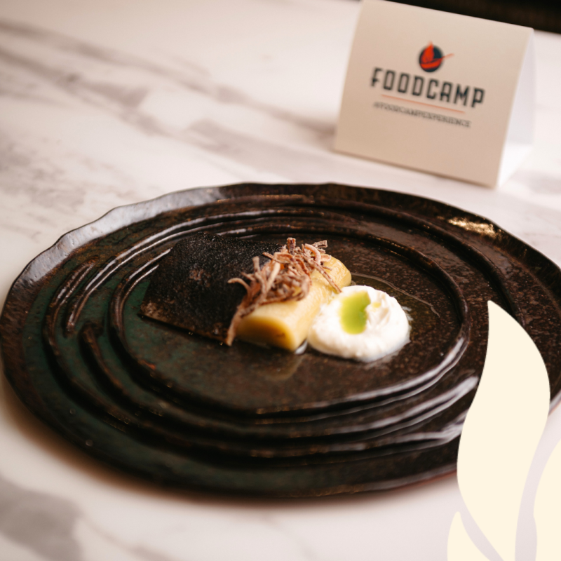 La recette des chefs Cassandre Osterroth & Pierre-Olivier Pelletier, Foodcamp 2024. Apprivoiser le brûlé et préparer une délicieuse truite avec poireau et raifort.